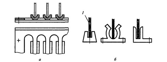 Направляющие вводятся в конструкции для быстрого сочленения ТЭЗ с ответными частями соединителей без заклинивания, зажима или перекоса, поддержки платы ТЭЗ при ударах и вибрациях, создания пути для кондуктивного отвода теплоты. Для входа и перемещения платы в направляющих по краям платы предусматривают свободную от печатного монтажа зону шириной 2—3 мм. Длина направляющих зависит от длины платы ТЭЗ. Различают коллективные направляющие, предназначенные для установки одновременно нескольких ТЭЗ (рис. 10, а), и индивидуальные (рис. 10,6).