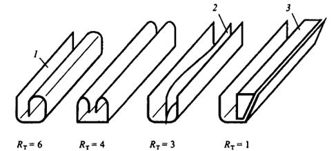 В качестве конструкционных материалов направляющих используется пластмасса и металл. Тепловое сопротивление RT металлических направляющих ниже, чем пластмассовых, и зависит от конкретной конструкции. На рис. 11 представлены конструкции четырех направляющих с указанием относительных величин их тепловых сопротивлений. Минимальным тепловым сопротивлением обладает клиновая направляющая. После установки ТЭЗ клин 3 винтом плотно прижимается к поверхности платы. Для бокового перемещения клина в направляющей под винт должно быть выполнено фигурное отверстие.