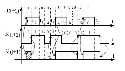6.1 JK - триггер – элементарный автомат, имеющий две входные переменные J и K, функция переходов описывается переключательной функцией: