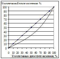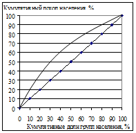 – кумулятивные доходы групп населения. Чем более неравномерно распределяются доходы, тем больше выпуклость.