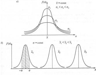 Большое значение имеет сопоставление фактических кривых с теоретическими. Наиболее часто в качестве теоретической кривой используют кривую нормального распределения (рис. 5), плотность распределения которой выражается уравнением: