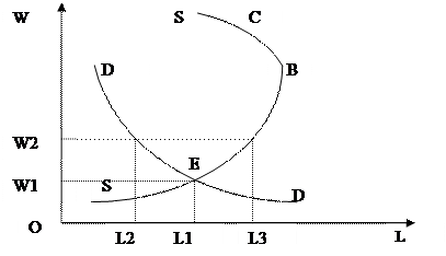 Однако при увеличении заработной платы до уровня W2 предложение труда может и убывать, что показывает участок ВС кривой предложения труда. Это возможно, во-первых, в слаборазвитых странах с низким уровнем жизни, когда увеличение зарплаты стимулирует работника уменьшать предложение труда. Во-вторых, в развитых странах с высоким уровнем жизни повышение зарплаты выводит работника на такой уровень потребления материальных и духовных благ, когда высшей ценностью для него становится свободное время, ради которого он сокращает рабочее время.