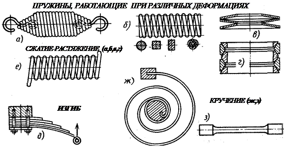 Обычно упругие элементы выполняются в виде пружин различных конструкций. Основное распространение в машинах имеют упругие пружины сжатия и растяжения. В этих пружинах витки подвержены кручению. Цилиндрическая форма пружин удобна для размещения их в машинах.