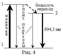 Время жизни в возбуждённом состоянии на этом уровне ~10-8 с. После чего происходит спонтанный переход на уровень1 или, что наиболее вероятно, безизлучательный переход на более низкий уровень 2. Энергия безизлучательного перехода 3→2 превращается в тепловую энергию кристаллической решётки рубина. Переход 2→1 запрещён правилами отбора. Это означает, что спонтанные переходы 2→1 маловероятны, т.е. уровень 2 является метастабильным. Время жизни в возбуждённом состоянии 2 порядка 10-3 с. Это примерно в 100 000 раз больше, чем в состоянии 3. При достаточной мощности накачки на уровне 2 будет создано состояние с инверсной населённостью. Теперь каждый случайно родившийся при спонтанном переходе 2→1 фотон может вызвать лавину индуцированных переходов 2→1, в результате чего появятся вторичные фотоны, точная копия первичных. Зарождается когерентное индуцированное излучение с длиной волны соответствующей переходу 2→1 (λ = 694,3 нм).