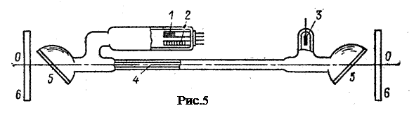 В первом газовом лазере (рис.5) в качестве активной среды использовали смесь газов гелия и неона, которыми в пропорции 10: 1 заполняли кварцевую газоразрядную трубку. Накачка газа производилась с помощью высокочастотного (ВЧ) генератора, который создаёт между вмонтированными в трубку электродами (катод 1 и анод 5) тлеющий разряд. Резонатор представляет собой два параллельных зеркала 6 установленных вне газоразрядной трубки перпендикулярно её оптической оси 00. Выходные окна 5 располагаются так, что перпендикуляр к их плоскости составляет с осью 00 угол Брюстера. Благодаря этому получают высокомонохроматическое, плоскополяризованное излучение и, кроме того, практически исключают потери на отражение от поверхностей выходных окон трубки. 2 – поглотитель посторонних газов. Процесс генерации излучения происходит в рабочем капилляре 4 газоразрядной трубки (d = 1÷10мм). Активными центрами являются атомы неона.