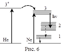Генерация лазерного излучения происходит при переходе атомов неона из возбуждённого состояния 3 на один из нижележащих уровней 2 (рис.6). Для этого необходимо увеличить населённость уровня 3 и уменьшить её на уровне 2. Гелий играет вспомогательную роль – способствует созданию инверсной заселённости рабочих уровней атомов неона. Накачка осуществляется в два этапа (рис.6). Электрический разряд возбуждает атомы гелия (Не), переводя их на метастабильный уровень 3*. Т.к. первый возбуждённый уровень 3* гелия практически совпадает с уровнем 3 неона, то при неупругих соударениях возбуждённые атомы гелия передают свою энергию атомам неона, а сами возвращаются в исходное состояние. В результате этого атомы неона из основного состояния переходят на уровень 3. Т.к. атомов гелия больше и их уровень 3* метастабильный, то на уровне 3 неона удаётся создать состояние инверсной населённости.