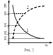 С другой стороны параллельно с вынужденным излучением имеет место конкурирующий процесс – поглощение фотонов. Число актов поглощения пропорционально заполненности энергетических уровней соответствующих основному состоянию атомов среды. В состоянии термодинамического равновесия распределение атомов по энергетическим уровням подчиняется закону Больцмана (рис.2). По оси абсцисс откладывается вероятность нахождения атома в данном энергетическом состоянии. Как видно из рисунка (кривая 1) «населённость» нижних уровней в соответствии с распределением Больцмана намного больше, чем верхних. Это означает, что актов поглощения будет больше, чем актов излучения. Кванты индуцированного излучения будут поглощены, так и не успев вызвать последующие вынужденные переходы. Т.О. усиление света не произойдёт.