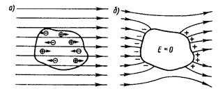 Если во внешнее электростатическое поле внести нейтральный проводник, то свободные заряды (электроны, ионы) будут перемещаться: положительные — по полю, отрицательные — против поля (рисунок слева, а).