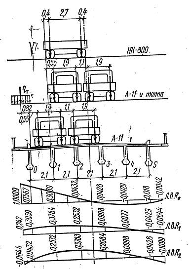 При расчете конструкций мостов на действие нескольких полос нагрузки АК самую неблагоприятно расположенную из них принимают с коэффициентом S1 =1. С остальных полос нагрузки принимают с коэффициентами S1 =1 для тележек и S1=0,6 для равномерно распределенной нагрузки. Коэффициент S1 учитывает уменьшение вероятности одновременного полного загружения всех полос.