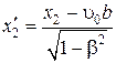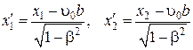 ‑ не изменяющиеся со временем t ¢ координаты концов стержня. Относительно системы К стержень движется со скоростью u0. Для определения его длины в этой системе отметим координаты концов x 1 и x 2 в один и тот же момент времени t 1 = t 2 = b. Тогда длина стержня в системе К равна l = x 2 – x 1. Из преобразований Лоренца следует