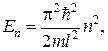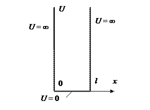 Рассмотрим движение частицы вдоль направления х, при этом движение ограничено непроницаемыми для частицы стенками: х = 0 и х = l. Потенциальная энергия U в этом случае равна (рис.13.1):