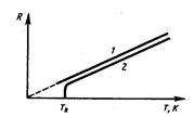 Впоследствии было обнаружено, что сопротивление многих металлов (например, Al, Pb, Zn и др.) и их сплавов при очень низких температурах, называемых критическими ихарактерных для каждого вещества, скачкообразно уменьшается до нуля (рисунок слева, кривая 2), т. е. металл становится абсолютным проводником.