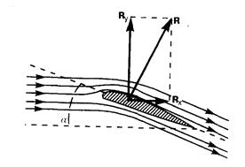 На тело, движущееся в жидкости или газе, действуют две силы (равнодействующую их обозначим R), одна из которых (Rx) направлена в сторону, противоположную движению тела (в сторону потока), — лобовое сопротивление, а вторая (Ry) перпендикулярна этому направлению — подъемная сила (рисунок слева).