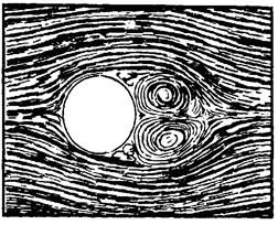 За телом возникает течение жидкости, направленное противоположно набегающему потоку. Оторвавшийся пограничный слой, следуя за этим течением, образует вихри, вращающиеся в противоположные стороны (рисунок слева).
