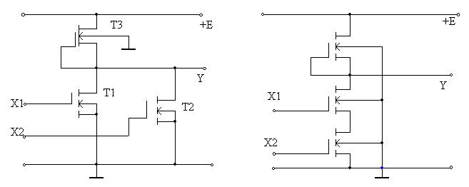 Рисунок 2 – Логические элементы ИЛИ-НЕ (а) и И-НЕ (б) на МОП-транзисторах n-типа