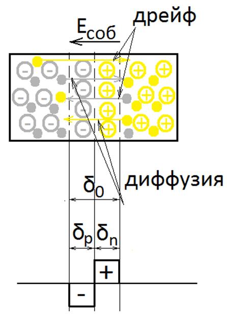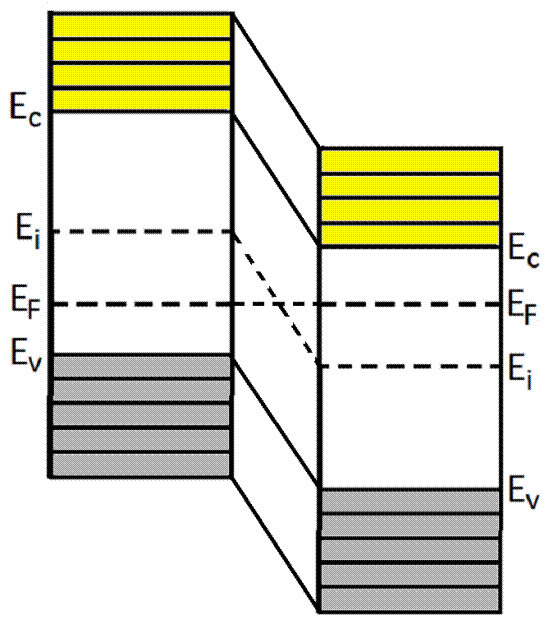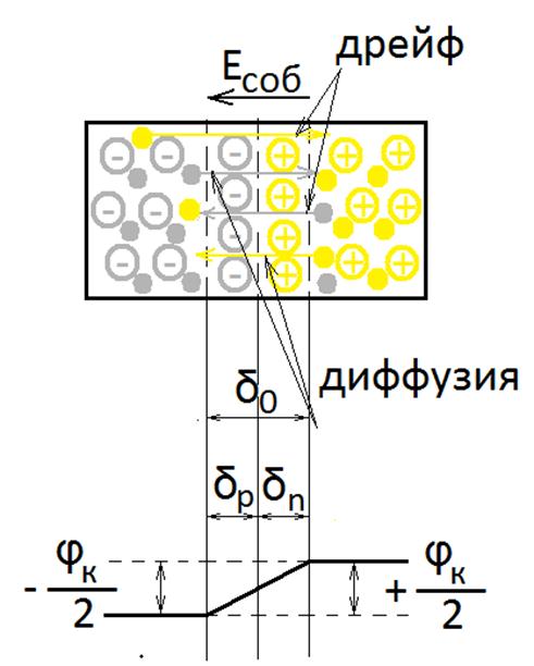 Поскольку потенциальная энергия электрона и потенциал связаны соотношением Е = -qU, образование нескомпенсированных объемных зарядов вызывает понижение энергетических уровней n-области и повышение энергетических уровней р-области.