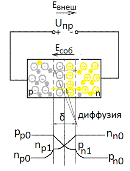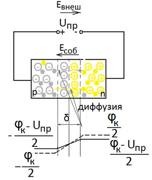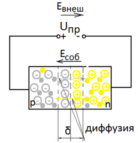 Прямое напряжение создает в переходе внешнее электрическое поле, направленное навстречу собственному.