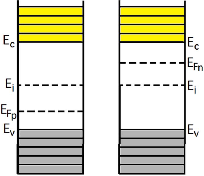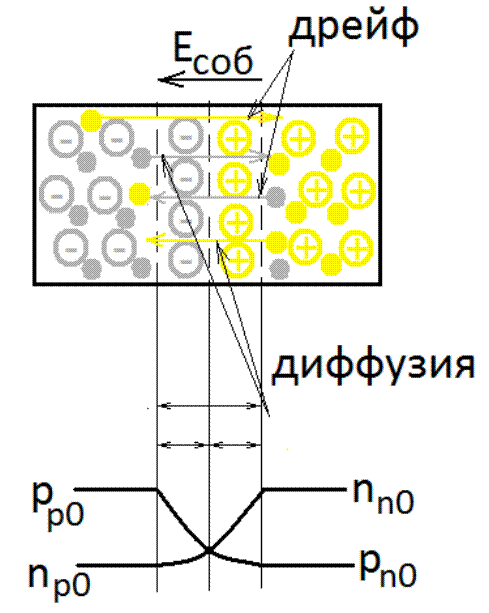 Поскольку потенциальная энергия электрона и потенциал связаны соотношением Е = -qU, образование нескомпенсированных объемных зарядов вызывает понижение энергетических уровней n-области и повышение энергетических уровней р-области.