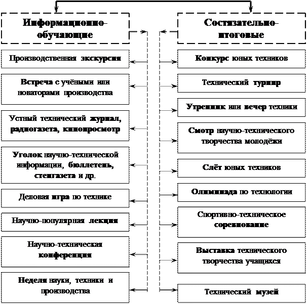 В организации и проведении данной работы самое активное участие принимают члены технических кружков, факультативов по технике, УКБ, НТОУ, первичных организаций ОО БОИР и других объединений учащихся. В школах, внешкольных и других учреждениях Республики Беларусь сложились традиционные массовые формы организации внеклассной и внешкольной работы по техническому творчеству учащихся, которые можно условно разделить (по основному предназначению или главному преобладающему признаку) на две группы: информационно-обучающую и состязательно-итоговую (рис. 2).