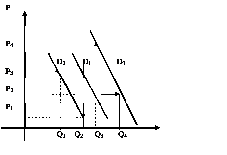 Когда сам спрос снижается, на графике кривая спроса смещается влево—вниз (из положения D1 в положение D2), причем не обязательно параллельно первоначальному положению. Снижение спроса означает, что за ту же цену (например, Р3) потребитель покупает меньшее количество товара — не Q2, a Q1 (сдвиг кривой влево), или за то же количество товара (например, Q2) он готов заплатить меньшую цену — не Р3, а Р1 (сдвиг кривой вниз). Когда спрос возрастает, графически это иллюстрируется смещением кривой вправо—вверх (из положения D1 в положение D3). Увеличение платежеспособного спроса отражает готовность потребителя платить большую цену (например, Р4, а не Р2) за прежнее количество товара Q3 (сдвиг кривой вверх), или желание и способность купить большее количество товара (Q4, а не Q3)за цену Р2 (сдвиг кривой вправо).