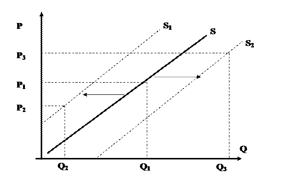 Графически изменение предложения под воздействием неценовых факторов можно изобразить следующим образом (рис. 6.2.2.). Сдвиг линии предложения влево под воздействием перечисленных факторов, свидетельствует об уменьшении самого предложения, а её сдвиг вправо – об увеличении самого предложения. Предложение подобно спросу можно разделить на эластичное и неэластичное.