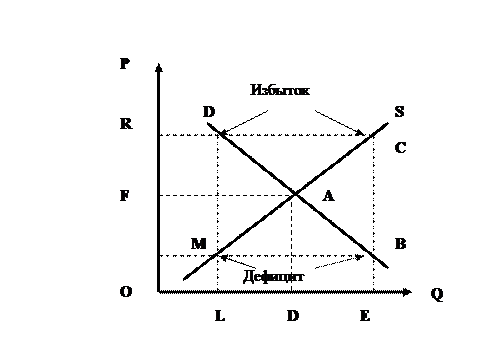 Уровень пересечения кривых спроса и предложения (точка А) и определяет уровень рыночной цены. Точка А называется точкой равновесия, а цена (F) - равновесной. Это - действительно уравновешивающая цена, ибо любая иная точка пересечения кривых означает диспропорцию между платежеспособным спросом и соответствующим ему товарным предложением.
