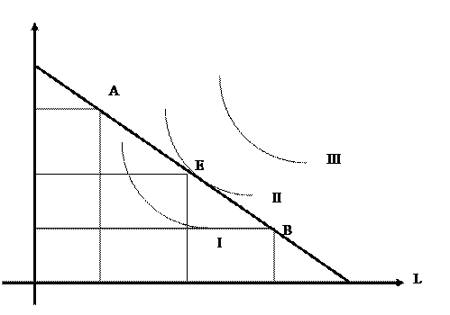 На рис. 8.1.2. в точках А и В представлены две такие комбинации производственных ресурсов. Эта прямая называется изокостой или бюджетной прямой. Ее наклон определяется обратным соотношением цен двух факторов. Нанесем на рис. 8.1.4. несколько изоквант—-1, II, III. Очевидно искомый максимум выпуска продукции будет представлен точкой Е, в которой изокоста касается изокванты П. Эта точка и дает нам положение равновесия производителя. В точке Е изокванта и изокоста имеют равный наклон, поэтому
