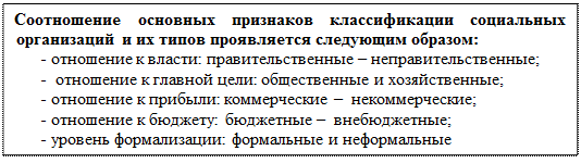 В литературе предлагаются типологии организаций с использованием различных признаков: взаимоотношение с внешней средой, тип организационной структуры, отношение к личности, организационно-правовые формы, отношение к собственности и др. [46]