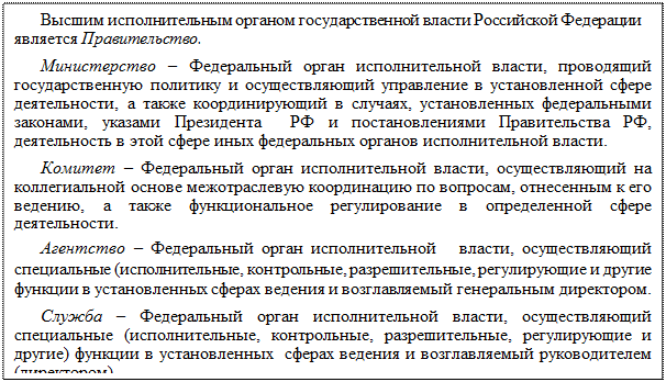 Особого внимания заслуживают государственные и муниципальные организации, относящиеся к некоммерческим организациям, то есть таким, которые ставят своей основной целью удовлетворение общественных потребностей. В частности, к ним относятся правительственные организации. Статус правительственных организаций присваивается высшим официальным органам власти. Они зафиксированы в Конституции РФ, указах Президента РФ.