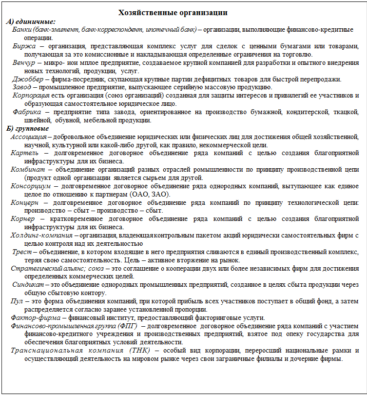 Хозяйственные организации предназначены для удовлетворения потребностей и интересов человека и общества преимущественно во внешней для организации среде путем производства продукции. Организации могут разделяться на управленческие и предпринимательские. Управленческие организации в форме «учреждения» или головной компании концентрируют управленческие и обслуживающие производство функции, например, стратегического управления, маркетинга. Предпринимательские организации в форме ООО, ОА выполняют преимущественно производственные функции.