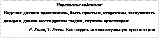 Видение может быть отнесено к «полюсу» мировоззрения, ценностей сотрудников, но, прежде всего, руководителя организации. Это уровень притязаний, не имеющих, зачастую, четких границ и конкретизации. Это идеальная картина будущего, в котором организация могла бы быть при самых благоприятных условиях. Идеалы – ориентиры, которые мы не рассчитываем достичь в обозримом периоде, но допускаем приближение к ним.
