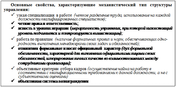 Для механистического (бюрократического) типа организаций характерны следующие структуры: линейная, линейно-штабная, функциональная, линейно-функциональная, дивизиональная).