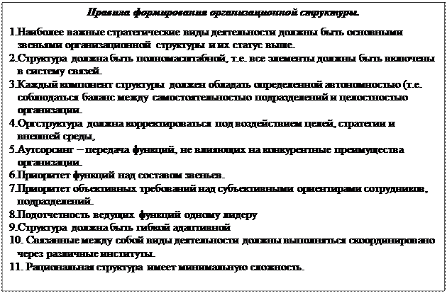 Помимо заявленных в таблице основных разновидностей имеются и другие виды организационных структур (бригадная, программно-целевая) и их сочетания в конкретной организации и в определенной внешней среде. В связи с этим при аудите, диагностике и проектировании оргструктур необходимо иметь представление об общих правилах их формирования[63].