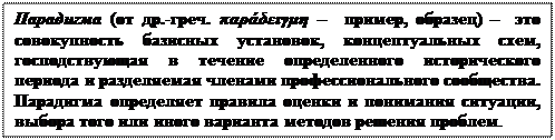 В научном познании парадигма как дисциплинарная рамка определяет ракурс рассмотрения объекта, диктует определенный набор средств и методов, позволяющих раскрыть его природу. Смена парадигм характеризуется революционными подвижками в понимании, познании и преобразовании действительности. Например, в последние десятилетия происходит формирование новой парадигмы менеджмента [9]. Парадигмальность присуща как отдельной научной дисциплине, так и всему научному познанию.