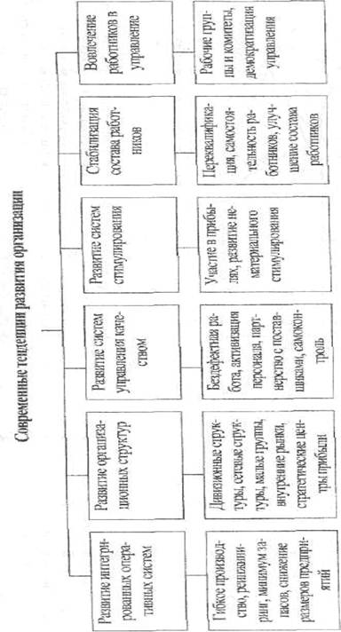 Все более очевидным становится то, что главной характерной чертой новых систем внутрифирменного управления должны стать ориентация на долгосрочную перспективу, проведение фундаментальных исследований, диверсификацию операций, инновационную деятельность, максимальное использование творческой активности персонала. Децентрализация, сокращение уровней управления, продвижение работников и их оплата в зависимости от реальных результатов станут основными направлениями изменений в аппарате управления. Некоторые наиболее заметные тенденции развития организаций показаны на рис. Ю. 2.