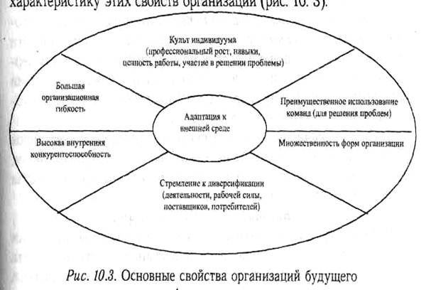 ры. Как адаптирующийся механизм, организация будет меняться в соответствии с изменениями внешних условий и объективных требований к ней. Обобщение происходящих процессов и наметившихся тенденций показывает, что на первый план выйдут такие черты организаций, как большая гибкость, приверженность индивидуумам, преимущественное использование команд, высокая внутренняя конкурентоспособность, стремление к диверсификации. Попытаемся дать характеристику этих свойств организаций (рис. 10. 3).