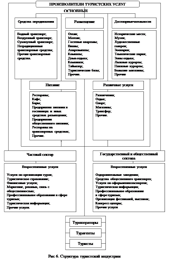 Характерной особенностью индустрии туризма является то, что она объединяет в себе предприятия, производящие как материальные (товары), так и нематериальные продукты (услуги).