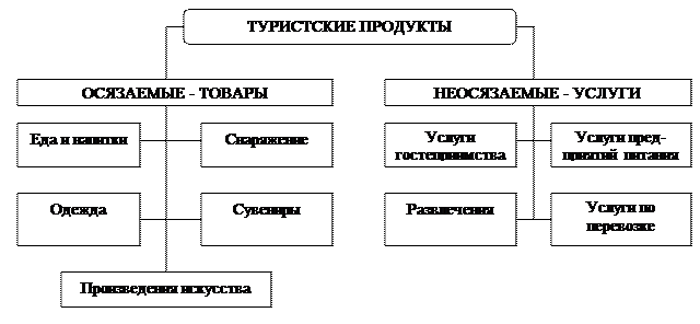 Как указано выше, туристский продукт — это комплекс осязаемых и неосязаемых услуг и товаров. К осязаемым относятся продукты питания, одежда, различное туристское снаряжение; к неосязаемым — услуги, которые оказываются туристам (рис.)). Заметим, что неосязаемые туристские продукты также являются товаром, но в отличие от осязаемых продуктов они не ограничены количественно и их нельзя складировать или накапливать. Производство и потребление неосязаемых туристских продуктов происходит одновременно во времени и исключительно в тех местах, где они произведены. Они используются только теми туристами, которые испытывают в них потребность. Такими неосязаемыми туристскими продуктами являются услуги гостеприимства, которые предоставляют размещение в определенном месте назначения; бронирование билетов; услуги питания, которые предлагают рестораны, услуги развлечения, которые предлагают театры, клубы и т. д. в тех же местах назначения.