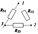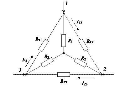 На рис. б, показана схема с узловыми точками 1, 2, 3, к которым включены резисторы R 12, R 23, R 31.