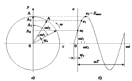 Пусть в плоскости с осями Ох, Оу вращается с постоянной скоростью w вектор ОА, длина которого равна амплитуде синусоидальной ЭДС e = E mахsin(w t + y e), т. е. ОА = E mах.