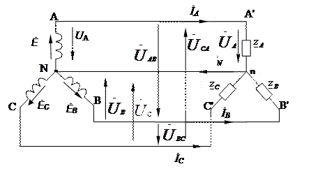 Таким образом, на векторной диаграмме удобно направлять векторы фазных напряжений от точки N к точкам А, В и С, т. е. противоположно условному положительному направлению напряжений на схемах.