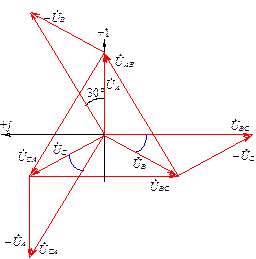 Как следует из векторной диаграммы и вышеприведенных формул соответствующие фазные и линейные напряжения сдвинуты по фазе на 30 °, причем вектора линейных напряжений опережают вектора фазных напряжений на угол 30°