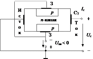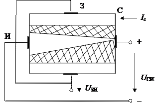 1. В ПТ n -типа основными носителями заряда в канале являются электроны. Затвор – это р -область. Между затвором и каналом образуются р - n -переходы. Когда между З и И приложено U зи < 0, запирающее р - n -переходы, оно вызывает вдоль канала равномерный слой, обедненный носителями заряда. Величина U си больше вызывает неравномерность обедненного зарядами слоя, наименьшее сечение проводящего канала − вблизи стока, сопротивление возрастает.