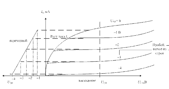 На начальном участке, когда U cи + | U зи| < U зап, ток I с возрастает с повышением U си; когда напряжение U cи ≥ U зап − U зи рост тока прекращается (участок насыщения). Увеличение отрицательного значения U зи (1−2−3−4 В) уменьшает величину U си и тока I c. Более высокое напряжение U cи приводит к пробою р - n -перехода и выходу из строя транзистора. По выходным характеристикам можно построить переходную или стоковую характеристику I c = f (U зи), U cи = const