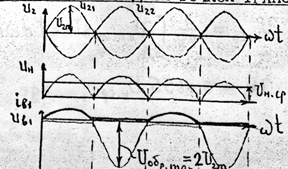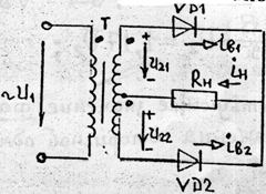 Напряжения вторичных обмоток трансформатора U 21, U 22 сдвинуты по фазе относительно средней точки на 180°. Если потенциал анода VD1 положительный, то он открыт,а VD2 – закрыт. При изменении полярности VD1 – закрывается, VD2 – открывается. В нагрузке ток i н имеет одинаковое направление в оба полупериода.. К закрытому диоду приложено