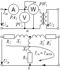 Опыт проводится при пониженном напряжении U 1к, которое устанавливается экспериментально: при отключенном напряжении на входе замыкают накоротко зажимы вторичной обмотки. Затем медленно увеличивают U 1 до значения U 1к, при котором показание амперметра равно I 1ном. Ваттметр измеряет мощность потерь в режиме короткого замыкания P к.