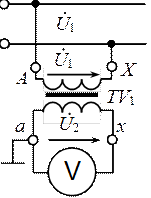 Измерив U 2 и зная коэффициент трансформации K н, можно определить высокое напряжение U 1 (шкалу вольтметра градуируют в значениях U 1). Одноименные выводы первичной и вторичной обмоток трансформатора маркированы: А и а, Х и х. Соблюдение полярности подключения важно для приборов, реагирующих на изменение фазы напряжения (ваттметр, счетчик).