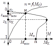 Точка n 1 соответствует режиму идеального холостого хода (n 1; М = 0). В точке s = s К (критический режим)АД развивает максимальный вращающий момент М К. Точка п характеризует пуск АД. В этой точке n = 0 и М = М п – пусковой момент двигателя. Участок n 1– n К характеристики устойчив, т. е. при нарушении баланса моментов М = М С (изменение нагрузки или питающего напряжения) происходит изменение частоты вращения, приводящее к новому балансу моментов (при М С < М К). Участок0– n К, как правило, неустойчив.