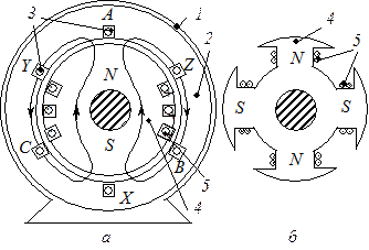 Конструкция синхронной машины: а – машина в сборе с неявнопюсным ротором; б – ротор явнополюсный.