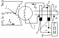 Обмотка ротора, называвмая обмоткой возбуждения, подключена к двум смонтированным на валу и изолированным от вала контактным кольцам 3. К кольцам примыкают подпружиненные щетки 4, через которые от генератора постоянного напряжения (возбудителя) в обмотку возбуждения подается постоянный ток возбуждения I в.